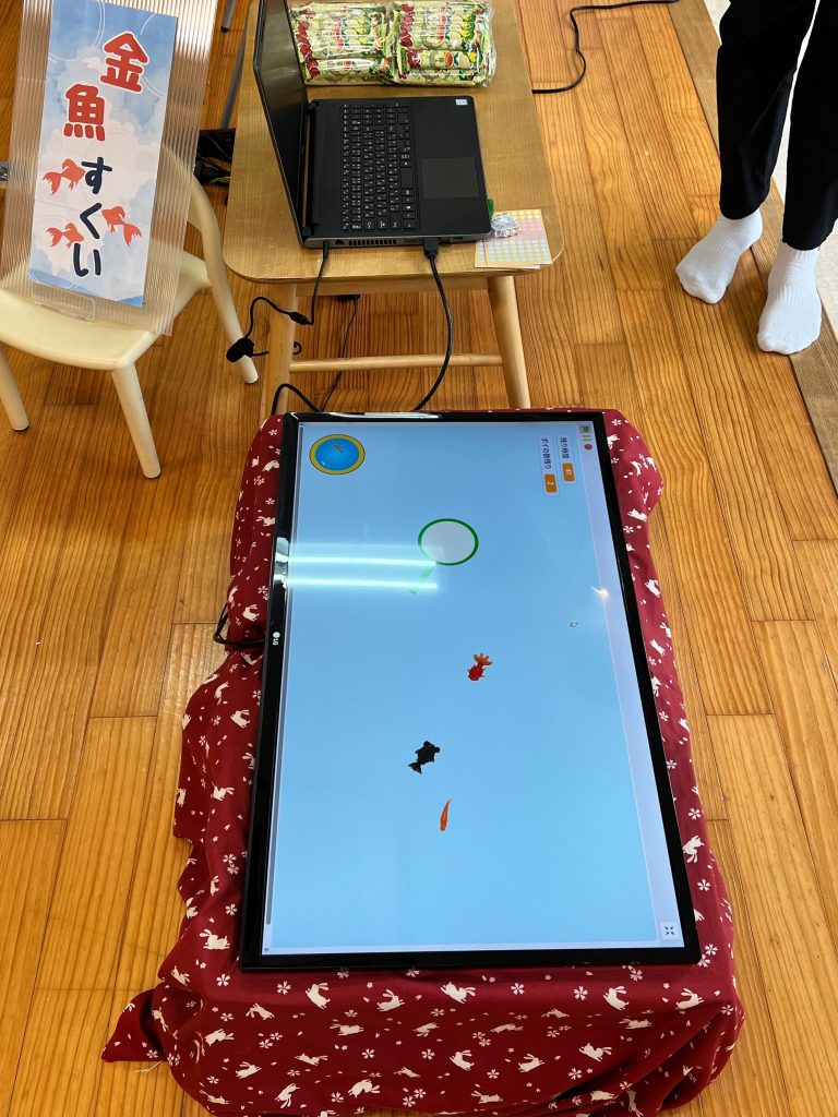 リアルな金魚すくいに近づけるよう画像のようにモニターの配置を工夫した金魚すくいです!