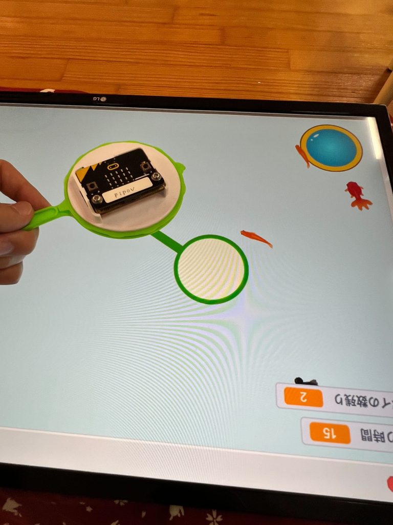金魚をすくうポイにmicrobitを設置してポイで金魚すくいをしている臨場感を出せるようにしました